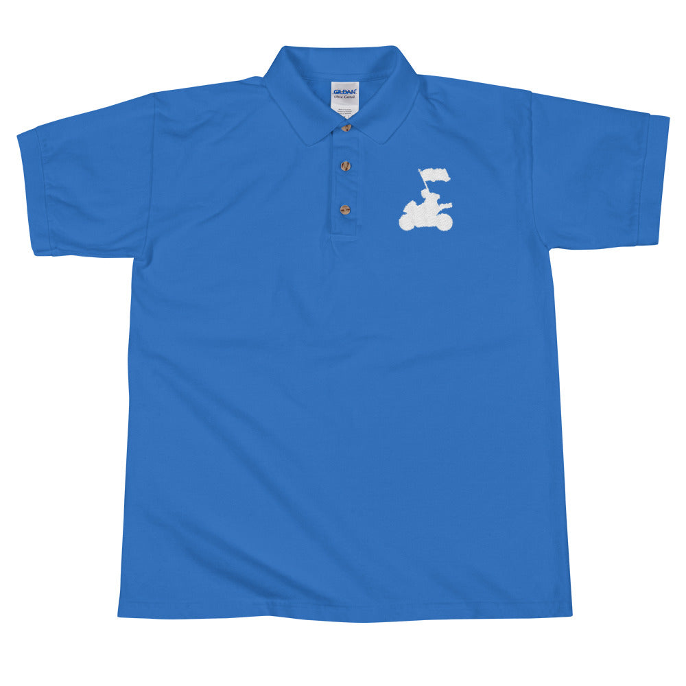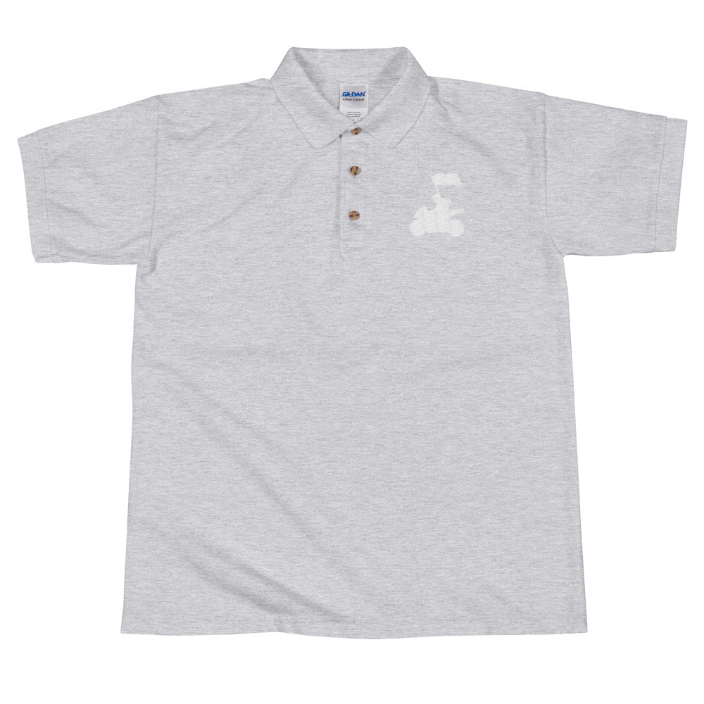 The E. McRiderman Polo Shirt from "Laugh now ride later" lets you be casual and express your love for motorcycles at the same time! Combine style and class with this 100% cotton polo shirt! The embroidered motorcycle riding flag wielding silhouette is a great conversation starter, and thanks to the pre-shrunk fabric, the shirt will maintain its shape after washing.